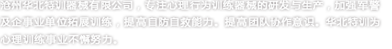 滄州華北特訓器械有限公司成立于2002年,是專業(yè)研發(fā)生產心理行為訓練器械、拓展器械、拓展器材、攀巖、兒童拓展器械的專業(yè)型企業(yè),并通過ISO-9001質量管理體系認證及ISO-14001環(huán)境管理體系認證,致力于各職業(yè)群體提供的心理行為訓練器械、拓展器械、攀巖、兒童拓展器械等設備,使之不斷提升心理健康水平、充分開發(fā)自我潛能。我公司竭誠為廣大客戶提供專業(yè)化各類心理行為訓練器械相關產品和服務。